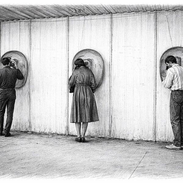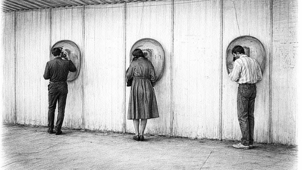 Градът беше шумен, но комуникацията – бавна и тежка, като зимно палто. Трите кръгли телефонни ниши на стената бяха като малки портали към други...